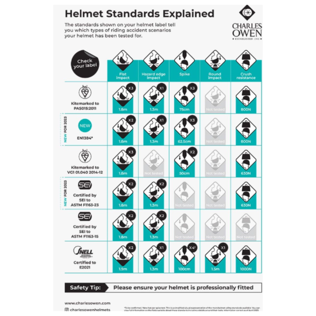 Charles Owen ridhjälmar är de med flest standarder och de vi får sälja över hela världen, vilket vi inte får med alla ridhjälmsmärken då olika delar av världen har olika krav på säkerhetsmärkningar och vad som krävs för en godkänd ridhjälm.